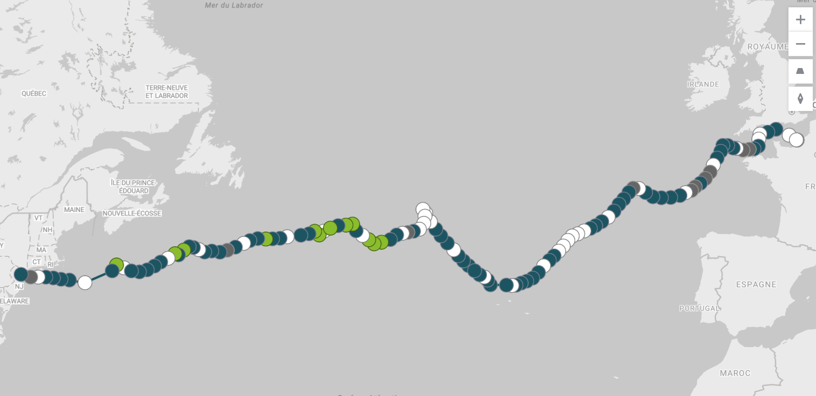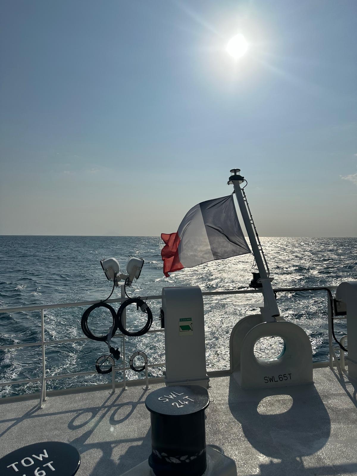 The French flag flutters proudly at the stern, a symbol of the journey so far. With the American coast approaching, arrival is just around the corner, and the adventure at sea nears its next chapter.