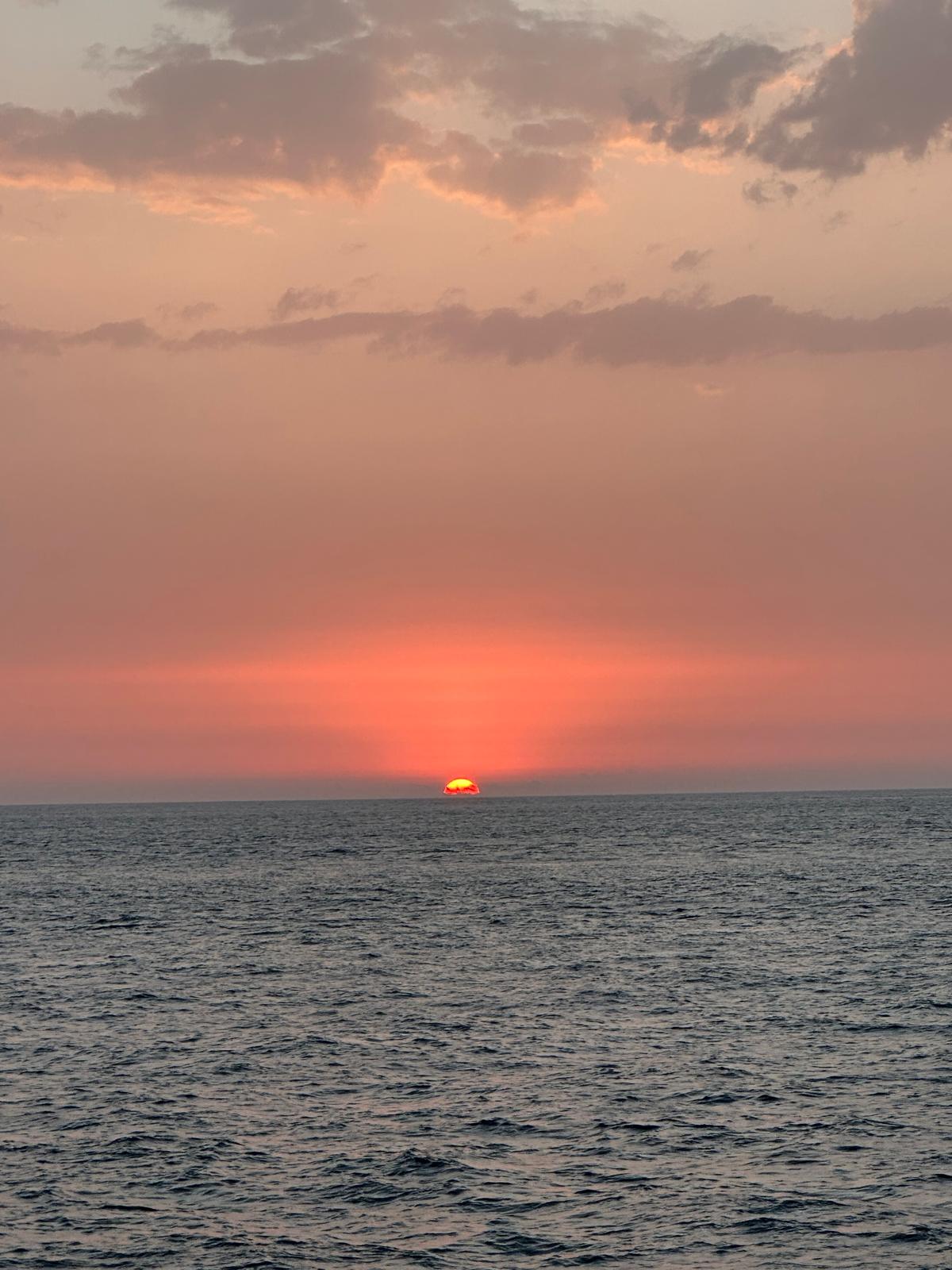 Days into the journey, the horizon glows with soft pink hues as the sun sets. The sea reflects the colors of the sky, a tranquil reminder of the beauty found in every moment on the voyage.