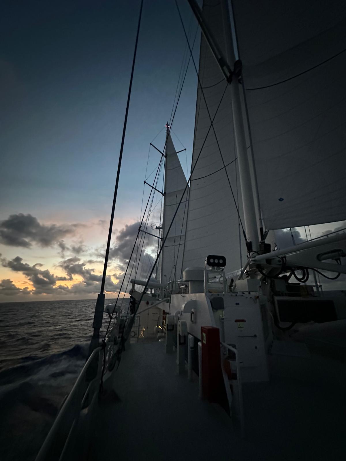 Days into the voyage, the vast expanse of the ocean stretches endlessly. The horizon meets the sky, reminding us of the freedom and adventure that every mile at sea brings.